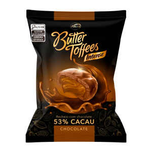 BALA ARCOR BUTTER TOFFEES INTENSE RECHEIO CHOCOLATE 53% CACAU SABOR CHOCOLATE PACOTE 90G