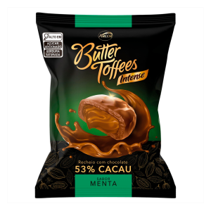 BALA ARCOR BUTTER TOFFEES INTENSE RECHEIO CHOCOLATE 53% CACAU SABOR MENTA PACOTE 90G